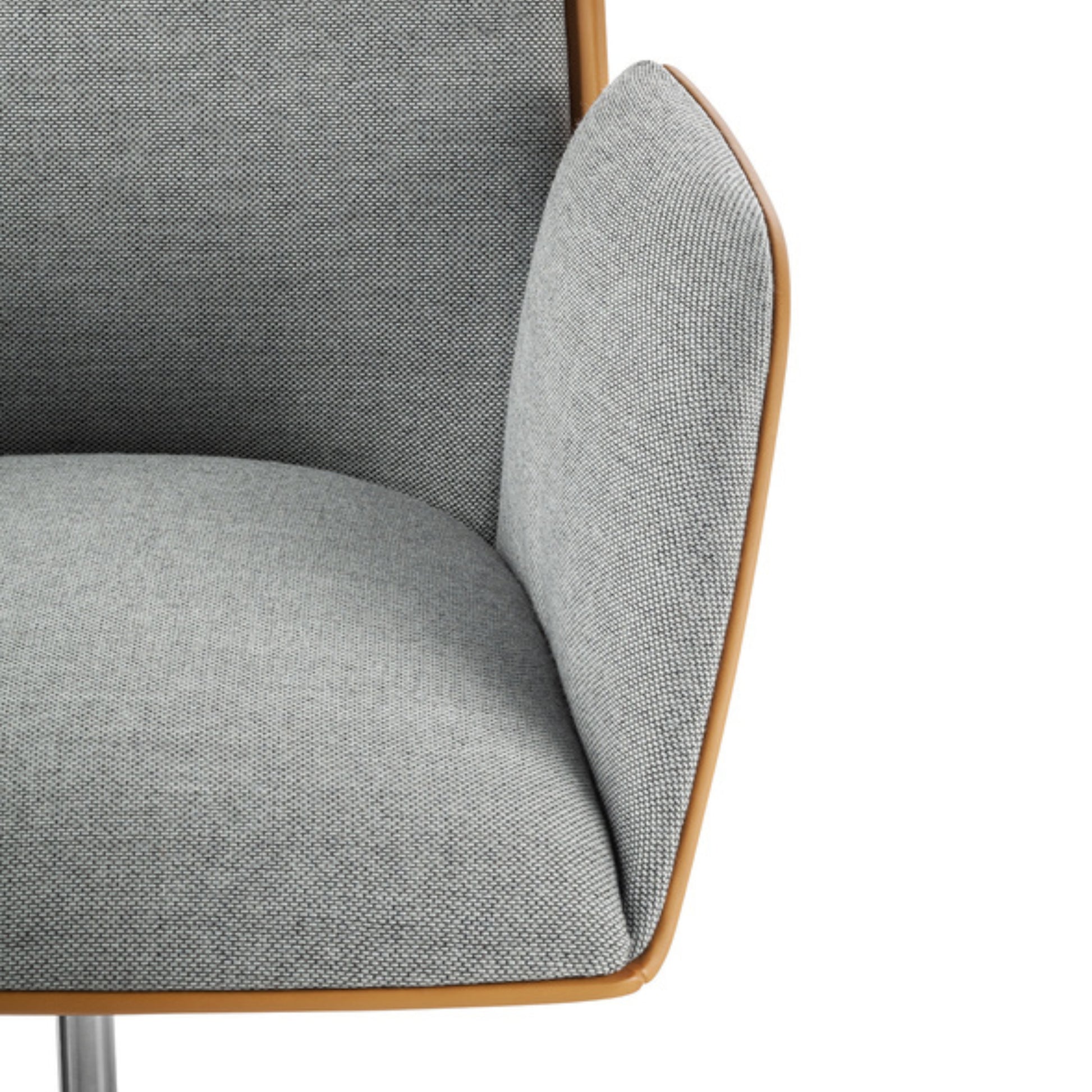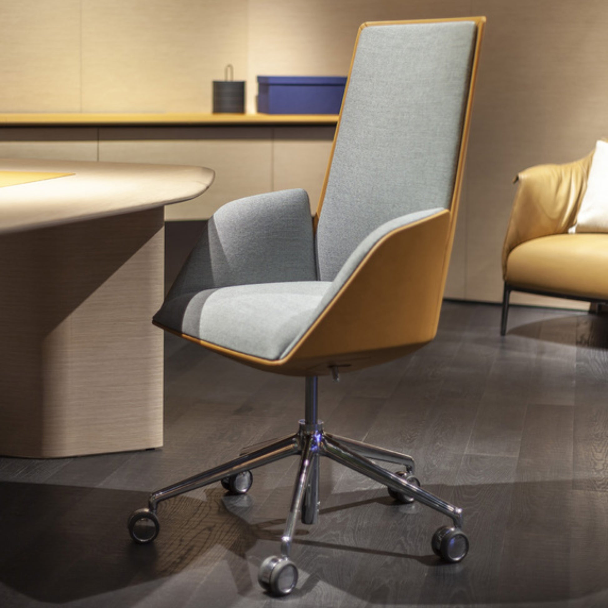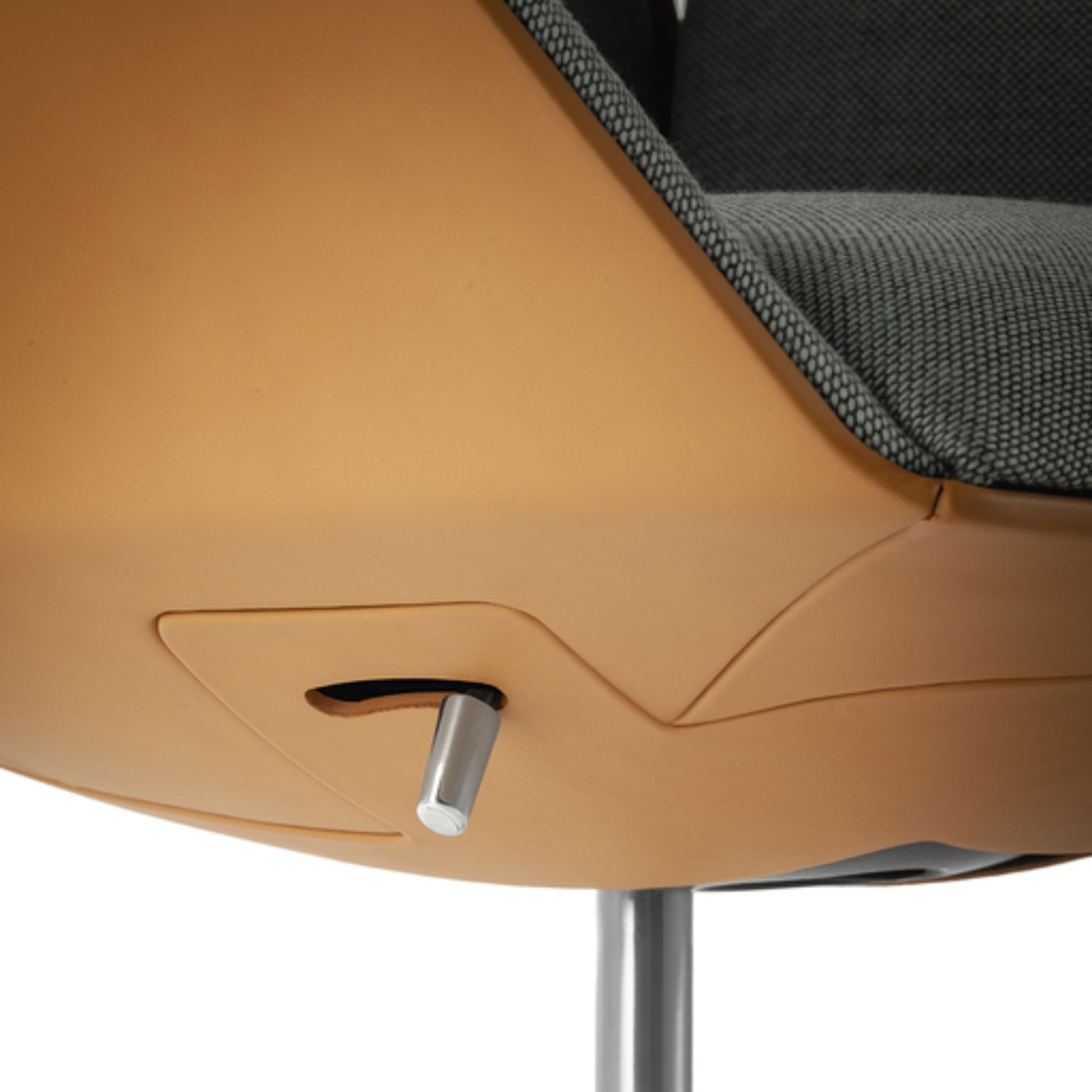 Nella sedia da ufficio Cercle, lo studio dell'ergonomia è particolarmente approfondito. Il meccanismo sincronizzato è integrato alla monoscocca ed è ulteriormente ottimizzato da Poltrona Frau per offrire altissime prestazioni di comfort. La struttura è in poliuretano con inserto metallico. L’imbottitura è in poliuretano espanso a densità differenziata per le zone di maggior comfort e trapunta in ovatta poliestere. Il basamento in alluminio lucido o verniciato nero è a cinque razze, con colonna di collegamento al carter attrezzata con molla a gas e verniciata in accordo alla finitura del basamento. La sedia da ufficio Cercle è disponibile con diverse tipologie di appoggi e può essere rivestita completamente in Pelle Frau®, o nella soluzione che abbina la pelle della scocca al tessuto della superficie interna.