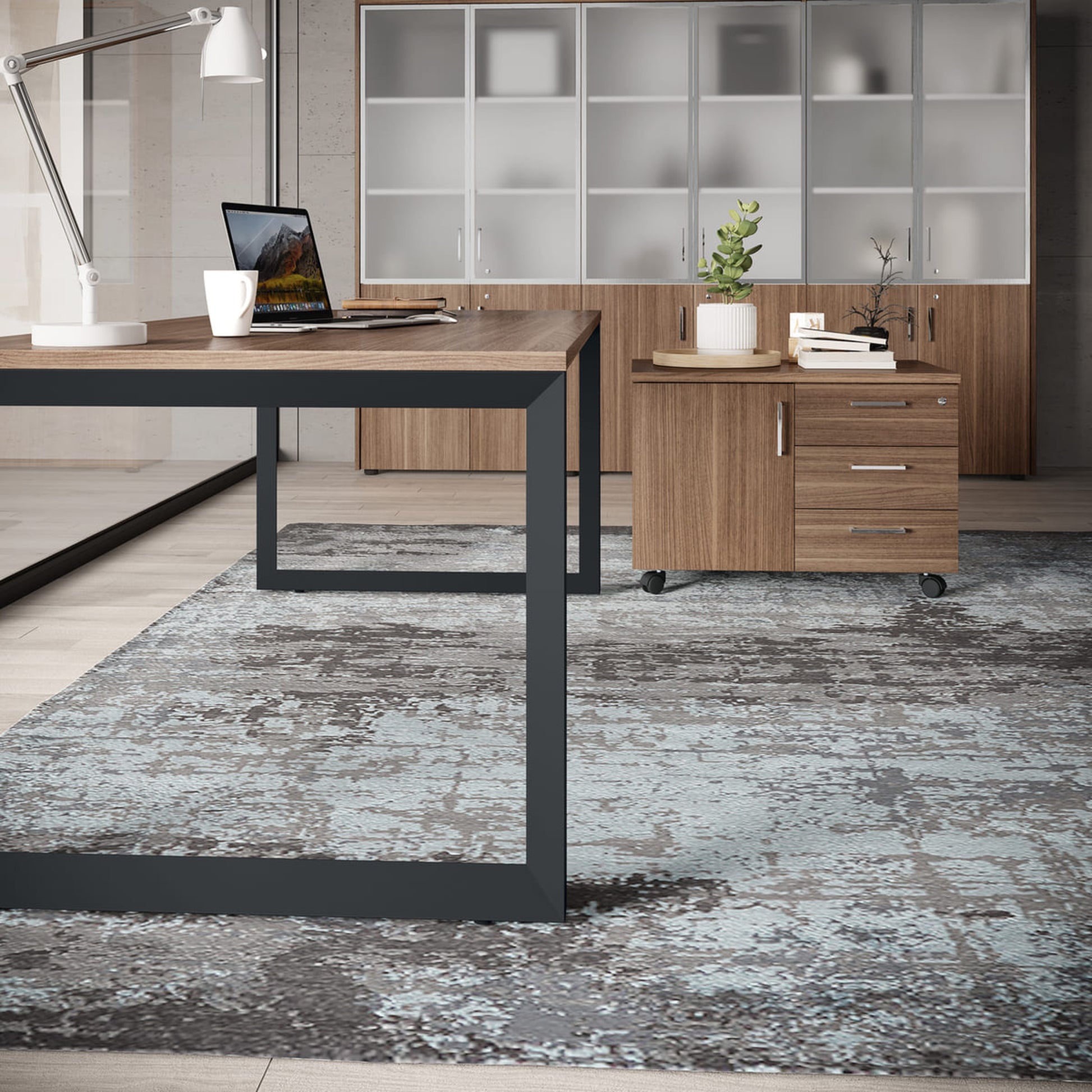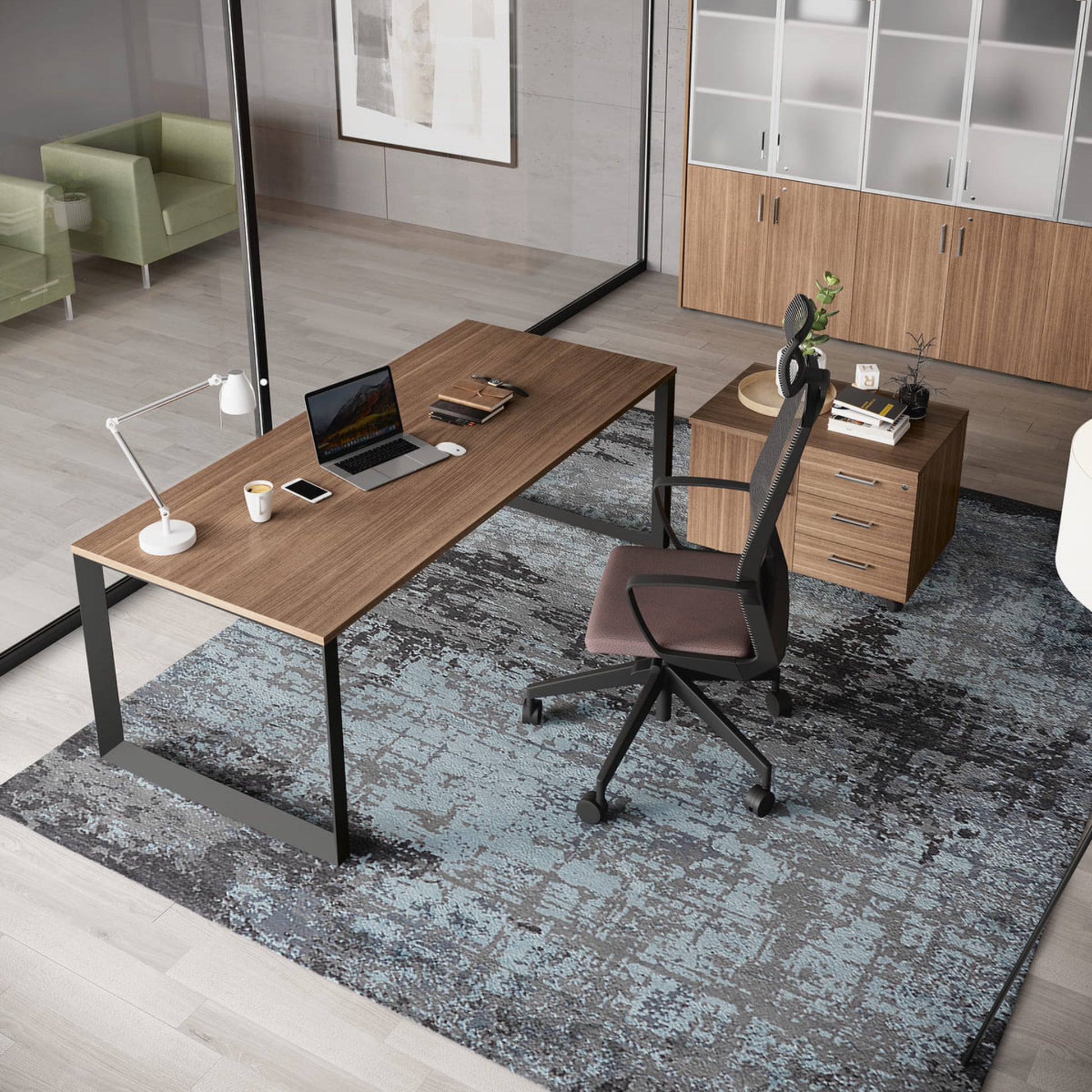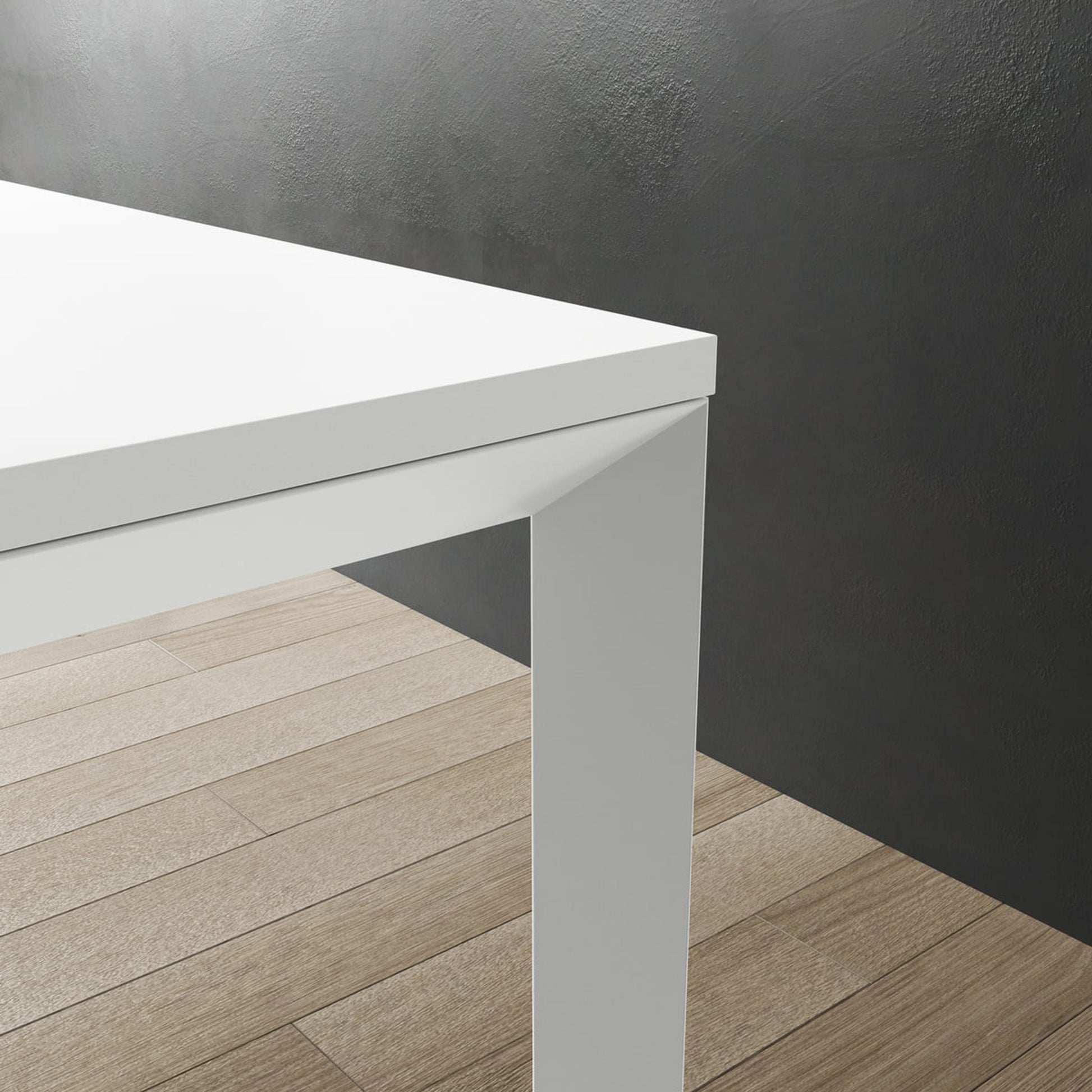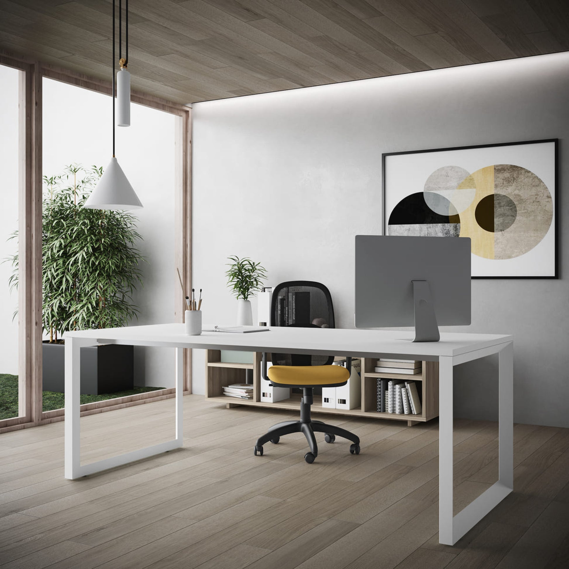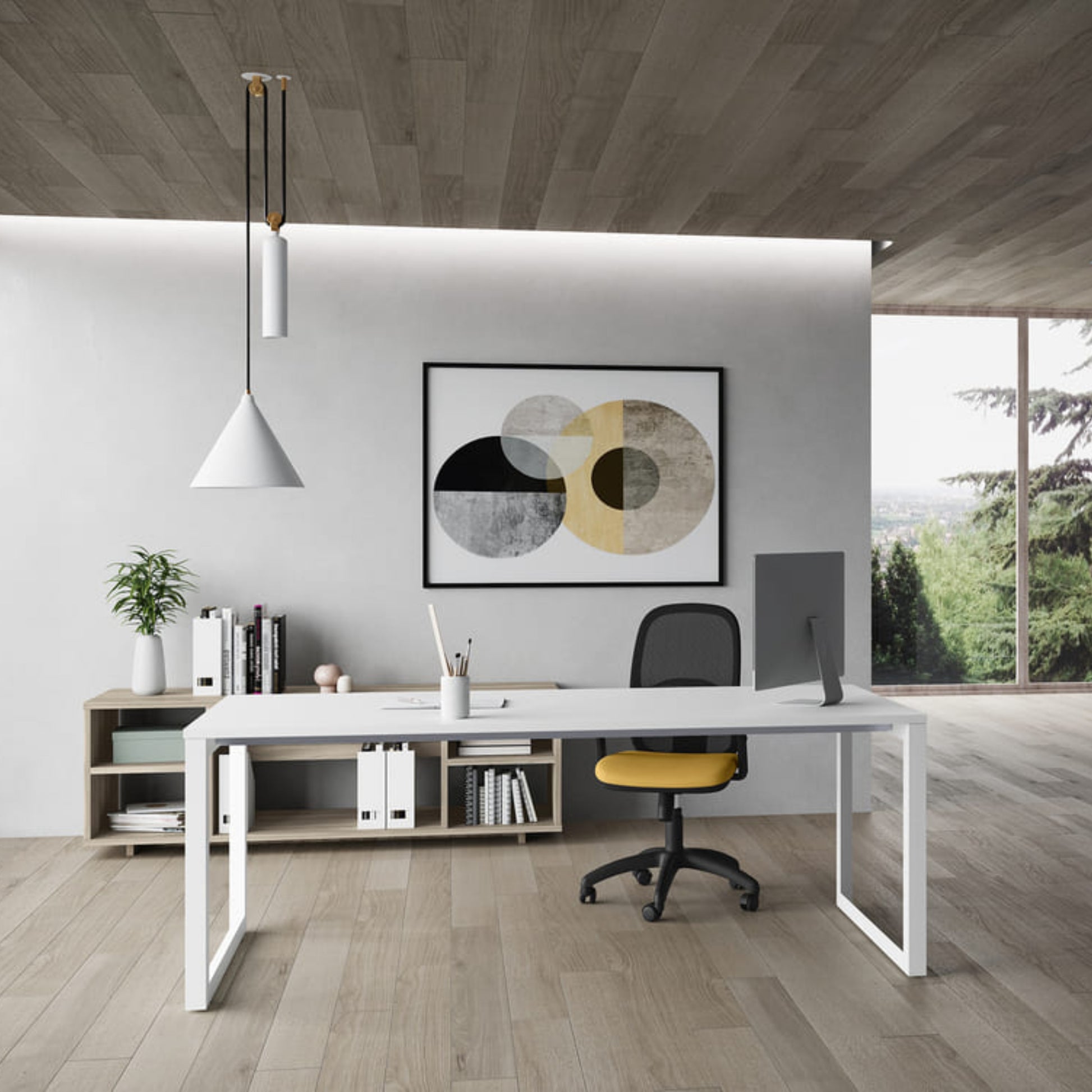 Scrivania operativa con struttura disponibile nelle finiture bianco, alluminio e nero e per garantire privacy, se prestata ed essere integrata in un pannello divisorio in melaminico.